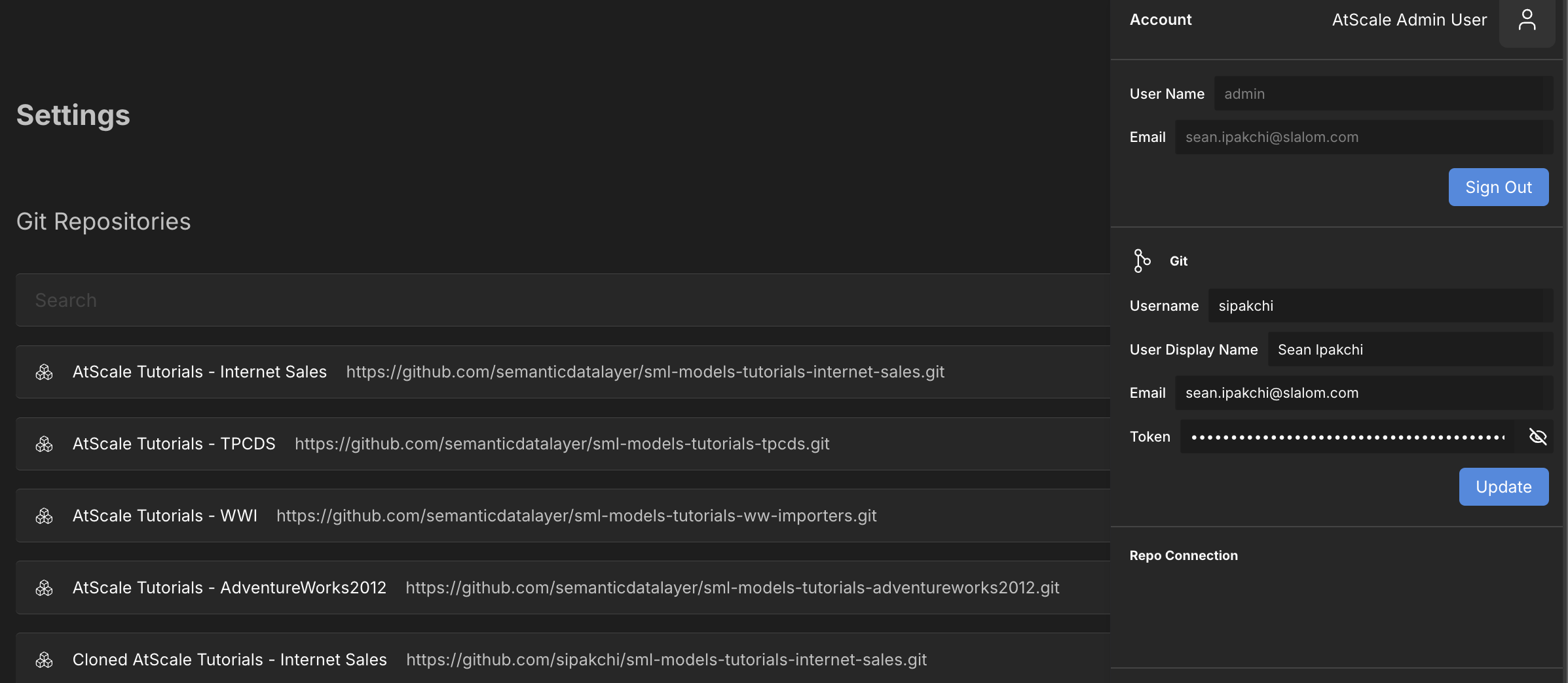 I was able to successfully launch a docker container of the AtScale Dev Edition with enough cpu/ram resources and no terminal errors (all green). I was able to login enter my license key, and made sure that the Pool Status and Connection Status showed “Up”. What is strange even after waiting for a long time and stopping and restarting the container from scratch, when opening the Repo Browser, I only see this error "There are no GIT repositories defined that you can access. Please add one from the Settings menu." Within the settings menu I see all the public AtScale Tutotorial repos, and I even cloned one to my GIT and setup the personal access token to see if it would resolve the issue, but still no go. Wondering if there's any suggestions on how to fix this error?
